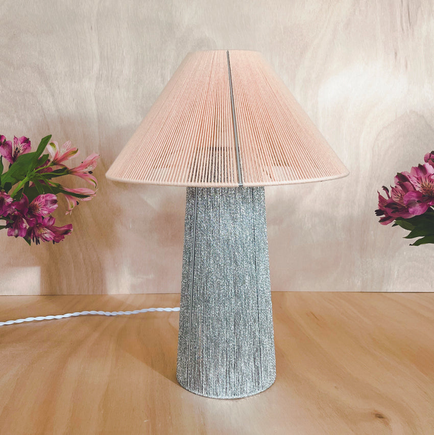 Tissée à la main avec du fil de coton sur une structure réalisée sur-mesure. Fabrication française. (teintes 61 nude et silver) Structure lampe à poser 04.
