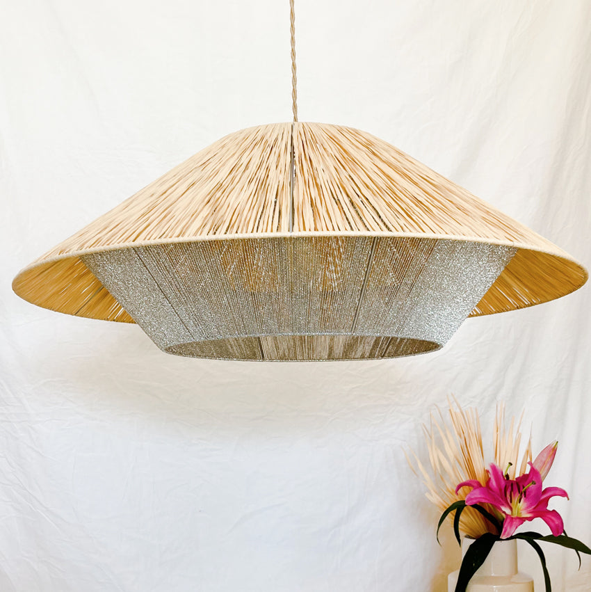 Ce modèle est tissé à la main avec du fil argenté et du raphia sur une structure réalisée sur-mesure. Fabrication française. (teintes n°56 sand & silver) Structure G.